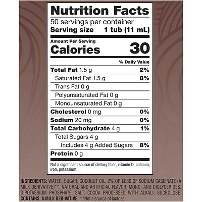 Coffee-mate is America’s #1 coffee creamer. With a variety of flavors and formats, Coffee-mate has your coffee creamer needs covered. Delight your employees, customers and guests by offering Coffee-mate liquid creamer in your workplace, break room or kitchen. Country of Origin: USA. INGREDIENTS: Water, sugar, coconut oil, less than 2% of sodium caseinate (a milk derivative))**, natural and artificial flavor, mono- and diglycerides, dipotassium phosphate, salt, cocoa processed with alkali, sucralose. Contains: a milk derivative. **Not a source of lactose.