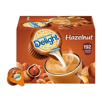 Make everyday coffee extra-flavorful with this non-dairy hazelnut creamer. It comes in a box of 192 individual portion control cups, allowing customers and employees precise preparation of single-serve coffee. This International Delight hazelnut liquid creamer doesn’t require refrigeration due to its special pasteurization process and packaging, so it’s convenient for bulk stocking in the workplace, hotel or cafe business.