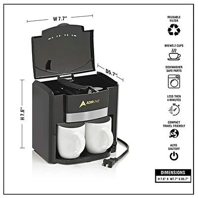 When you and your spouse roll out of bed in the morning, the first thing you want is that first cup of coffee. As the name suggests, the AdirChef BFF Coffee Maker For Two conveniently brews two fresh cups of coffee, making it ideal for you and your spouse, significant other, business partner, or a best friend or friendly neighbor who just unexpectedly drops by. Expertly crafted of durable plastic and ceramic construction to provide long-term strength and use, the coffee maker boasts a sleek modern designto stylishly fit into any interior space. Additionally, it comes with an environmentally friendly reusable filter to save resources and the parts are dishwasher safe for quick and easy cleaning. The AdirChef for Two is a great solution to quickly offer two fresh cups of coffee in just three minutes. Preparing coffee is easily done by just filling the reusable filter with your favorite coffee blend and the reservoir with water, then pushing the start button. It even has an auto-shutoff feature to save power for your convenience.
