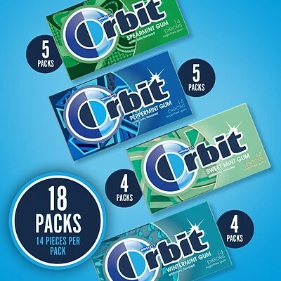 With the Variety Pack, you get four delicious ORBIT flavors: Peppermint, Wintermint, Spearmint and Sweet Mint.