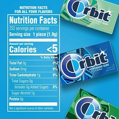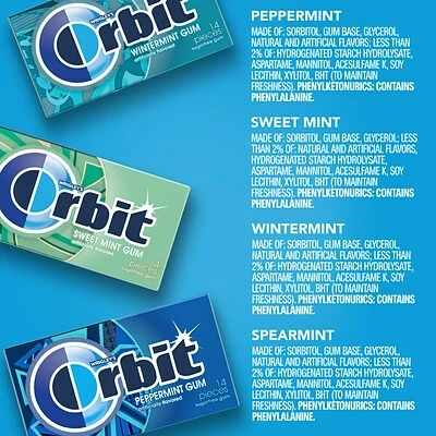 With ORBIT Sugar Free Gum, delicious variety pack of ORBIT Spearmint Chewing Gum, ORBIT Wintermint Chewing Gum, ORBIT Sweet Mint Chewing Gum, ORBIT Peppermint Chewing Gum flavors that give you a clean and fresh mouth feeling so you’re ready to seize your moment with this bulk gum assorted pack.