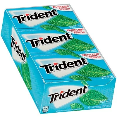 A 12-Count of 14-Piece packs of Trident Sugar Free Gum in minty Mint Bliss flavor
