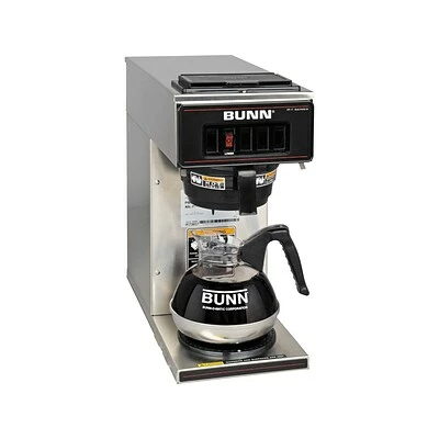 The Bunn VP17-1 12-cup coffee brewer provides simple switch-control office coffee service that does not require plumbing or special wiring. The SplashGard funnel deflects hot liquids away from the hand. The brewer features one lower warmer. No plumbing required makes this brewer completely portable.
